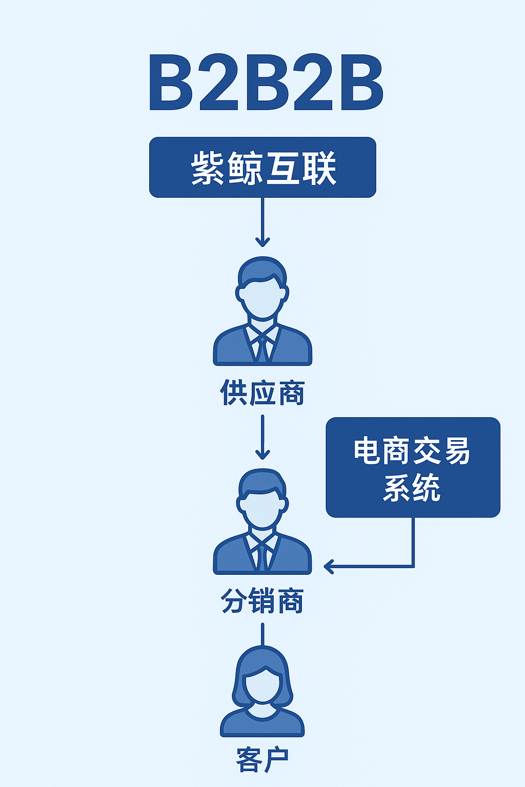 B2B2B模式的核心特点在于多层级交易关系,即企业不仅与供应商直接交易,同时还可以管理分销商与下游企业。紫鲸互联的系统源码支持: